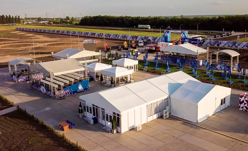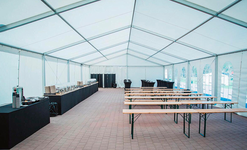 Сборно-разборная конструкция шатра позволяет в короткие сроки возвести помещение защищённое от неблагоприятных условий внешней среды на любой ровной поверхности. Низкий вес конструкции, при высокой несущей способности и привлекательном внешнем виде позволяет использовать двухскатные конструкции в большом количестве разных сценариев, от сооружения временного склада, до реализации пространства для проведения свадьбы. Используемый ПВХ-тент может отличаться не только производителем и группой горючести, но и светопропускной способностью. При необходимости можно использовать прозрачный тент ПВХ или крышу из материала Blackout который не пропускает свет и защитит внутреннее пространство шатра от нагрева и прямых солнечных лучей.