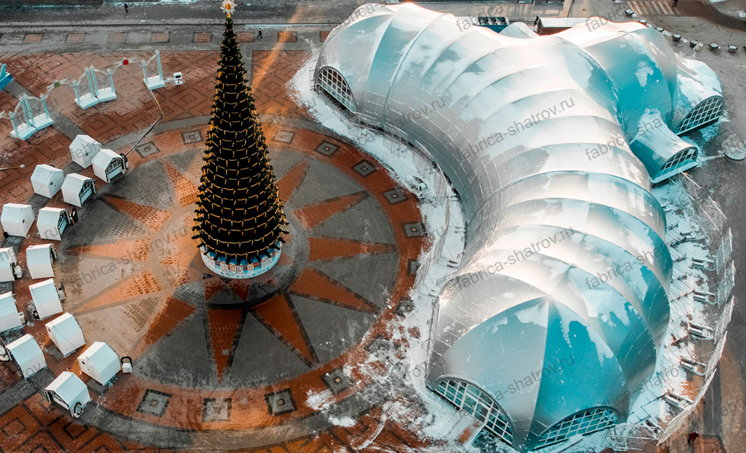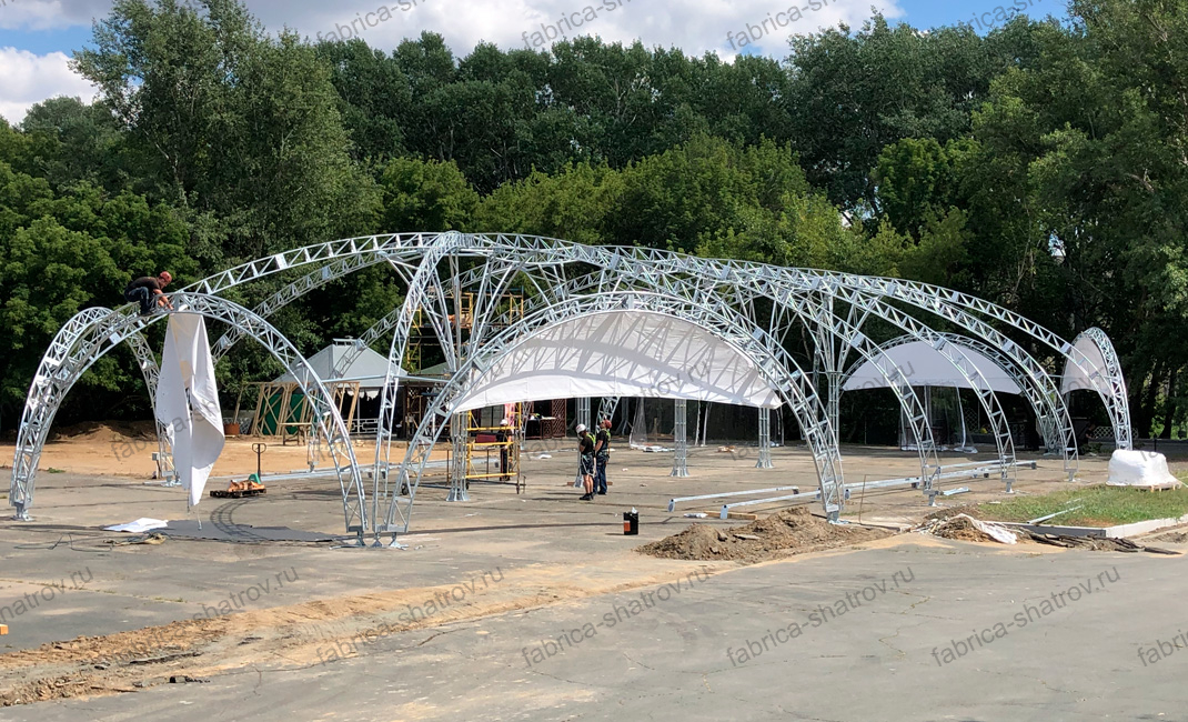 Большой гексагональный арочный шатёр на основе каркаса из стали с защитой от коррозии методом горячего цинкования. В качестве покрытия используется армированный тент ПВХ высокой плотности с защитой от УФ-излучения и двухсторонней пропиткой от гнили и плесени. Возможно изготовление уникальной арочной конструкции на заказ. Являемся производителем каркасно-тентовых конструкции с собственным инженерным отделом, монтажными бригадами и производством полного цикла. С случае выбора типовых решений, предлагаем большое количество различный опций, которые позволят максимально кастомизировать шатёр под нужны вашего мероприятия. Оказываем услуги по аренде шатров с выполнением всех работ «под ключ», таких как: доставка, монтаж/демонтаж, вывоз конструкции, брендирование и прочие услуги.
