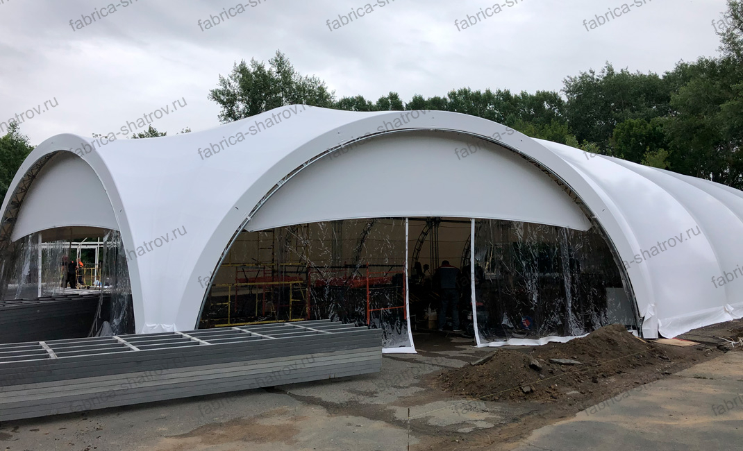 Арочные шатры гексагонального типа обладают большой покрывной площадью, красивым внешним видом и широкими возможностями применения. Комплектация шатра позволяет точно подстроить конфигурацию тентовой конструкции под решение конкретной задачи клиента. Шатёр может оснащаться мягкими или жёсткими стенами, быть реализован в холодном или теплом исполнении. Тент ПВХ представлен в трёх вариантах: классический, прозрачный ПВХ и ПВХ «Blackout» (не пропускает солнечный свет). Прочный арочный каркас надёжно защищён от коррозии методом горячего цинкования. Шатёр может быть установлен на любой ровной поверхности, его возведение не требует разрешения на строительство, при необходимости конструкцию можно разобрать и складировать. ПВХ-тент в стандартной комплектации не поддерживает горение и является пожаробезопасным. Каркас шатра имеет запас прочности. Он может быть украшен или использован для подвешивания осветительного и вспомогательного оборудования.