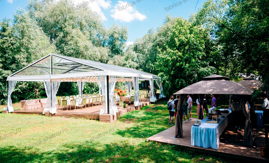 Двускатные шатры активно используются для проведения развлекательных и бизнес мероприятий, в коммерческих целях, торговле, для проведения свадеб на природе. Своим клиентам мы предлагаем качественные каркасно-тентовые конструкции собственного производства. Высокое качество наших конструкций обусловлено: применением хороших материалов со стабильно высокими эксплуатационными характеристиками, передовых станков и материально-технической базы, опытным штатом сотрудников с контролем качества выполняемых работ на всех этапах производства. Благодаря этому наши клиенты получают шатры мирового уровня с длительным сроком службы.