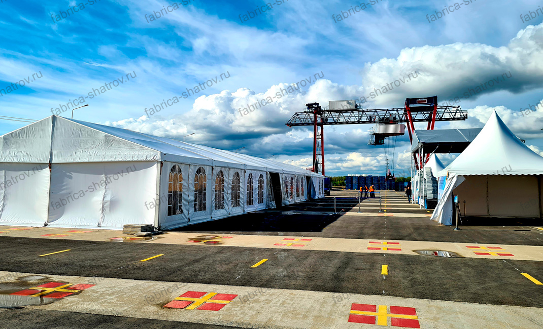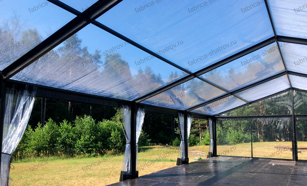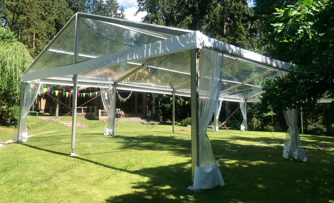 Длина шатра не ограничена и может быть любой, кратной пяти метрам. Для монтажа не требуется подготовка площадки, достаточно любой ровной поверхности. Каркас из анодированного алюминия имеет длительный срок службы, легкий, не ржавеет и обладает высокой несущей способностью благодаря использованию первичного алюминия и качественного сплава превосходящего по своим характеристикам отечественные ГОСТы. Каркас может быть изготовлен в чёрном исполнении, как и тент ПВХ. Чёрные шатры популярны при проведении развлекательных мероприятий за более строгий и стильный вид. Все крепёжные элементы обработаны методом горячего цинкования. При производстве шатра используется качественная фурнитура от ведущих мировых брендов.
