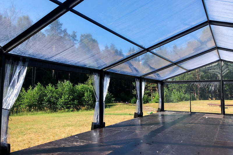 Прозрачный ПВХ-тент и чёрный каркас из анодированного алюминия создают привлекательный внешний вид. Пологи и полы на основе соснового бруса и фанеры позволяют комфортно и функционально использовать шатёр на природе в открытом и закрытом варианте. Прочный алюминиевый каркас из первичного алюминия (легированный сплав 6005А и 6082) с профилем собственной разработки позволяет увеличить прочностные характеристики конструкции на 20% без увеличения размера сечения. Запас прочности позволяет монтировать на каркас дополнительное осветительное оборудование и элементы декора создавая нужную функциональность внутреннего пространства шатра.